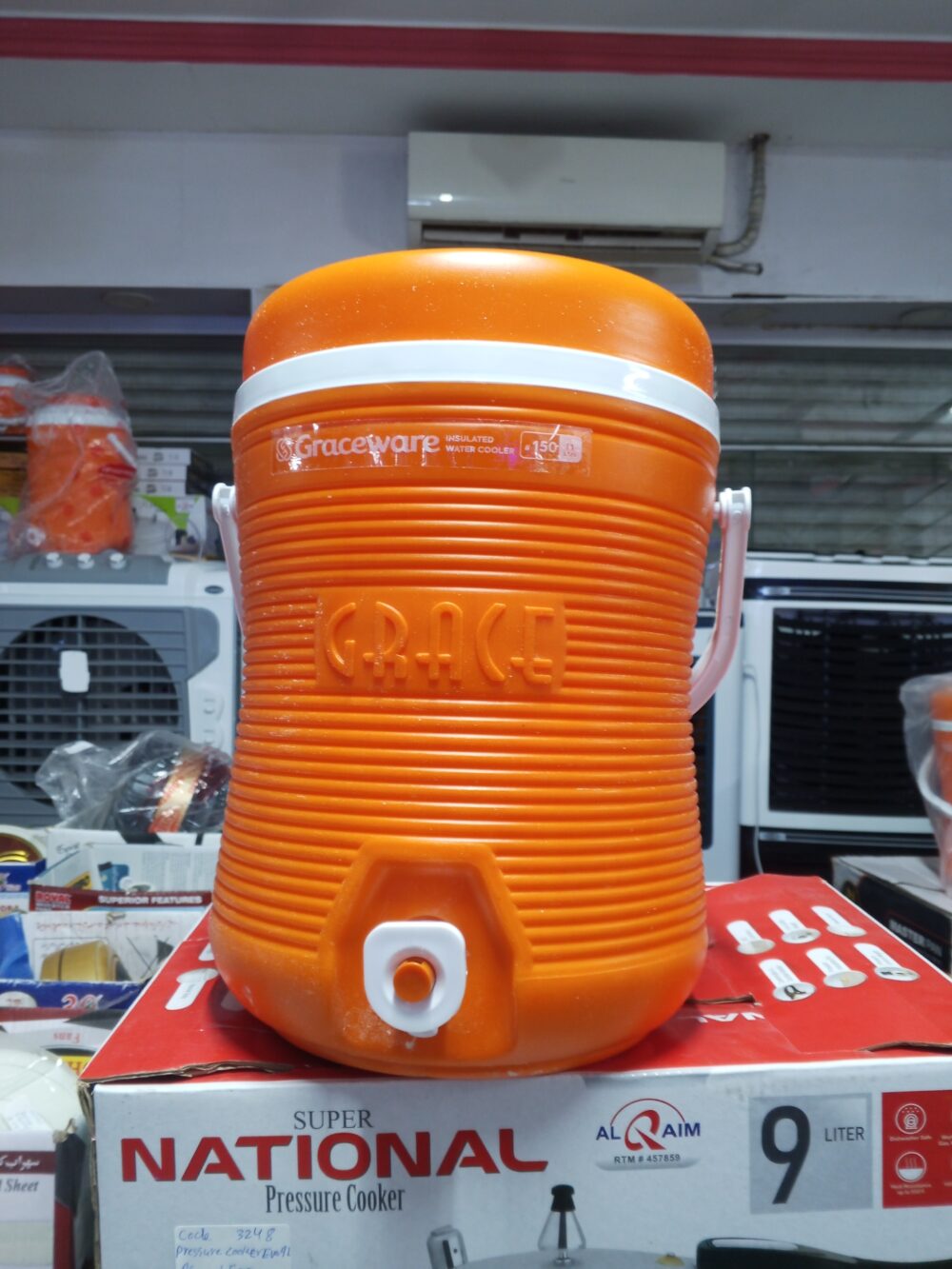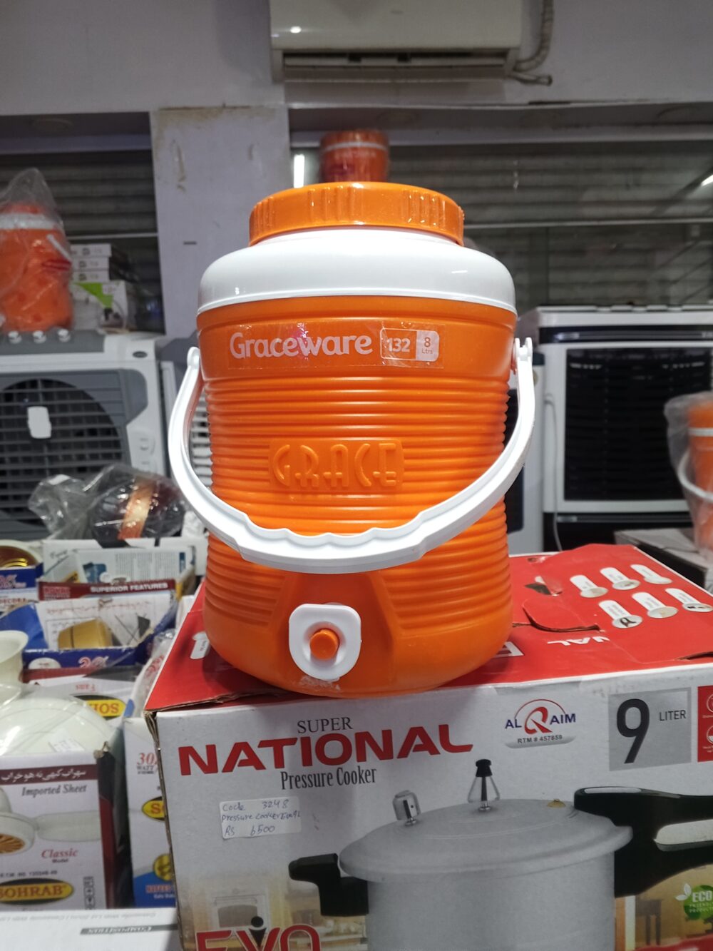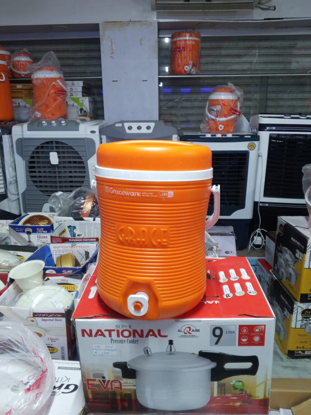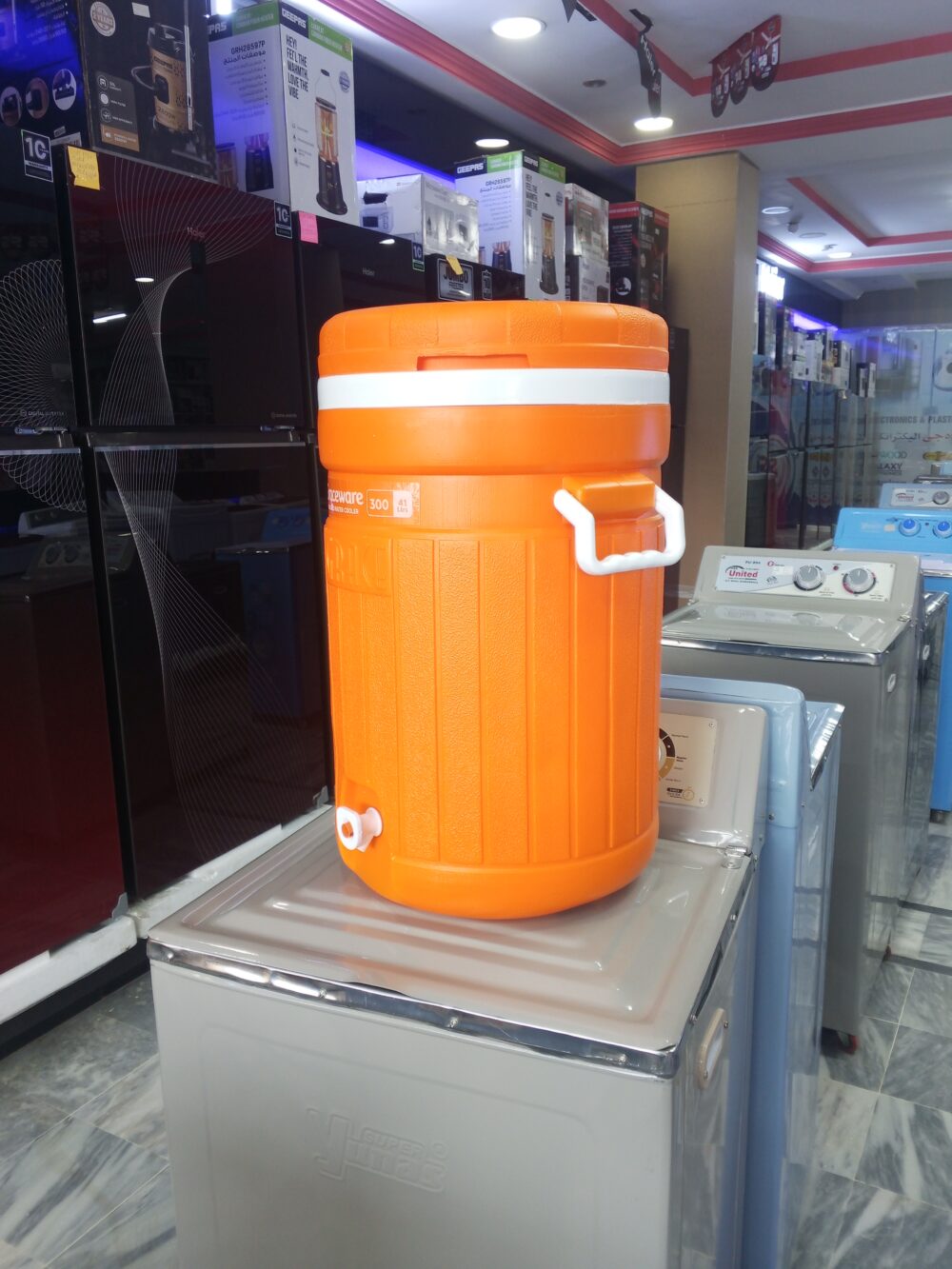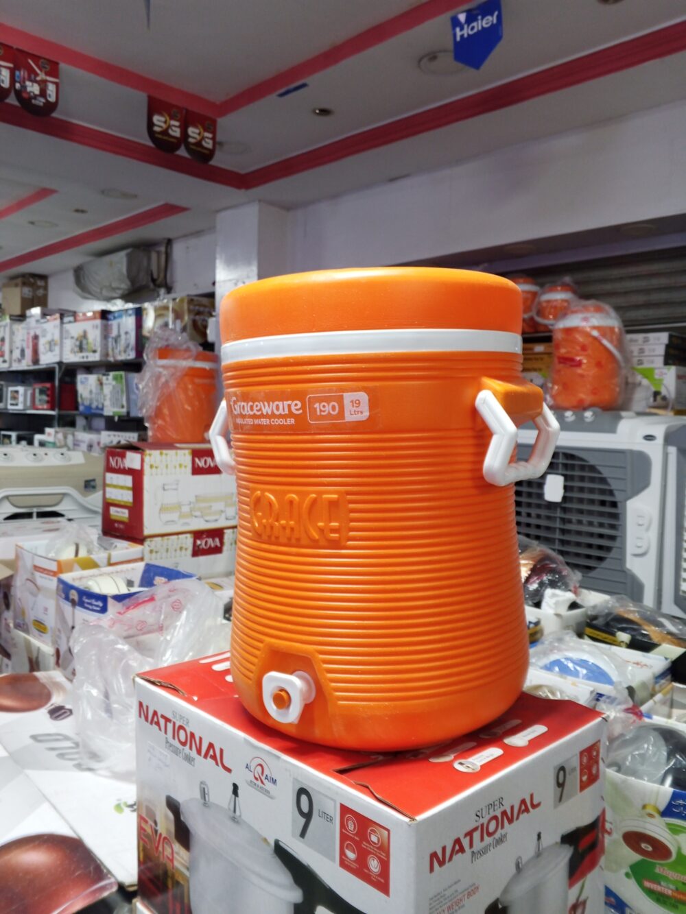 crockery items, plastic water cooler