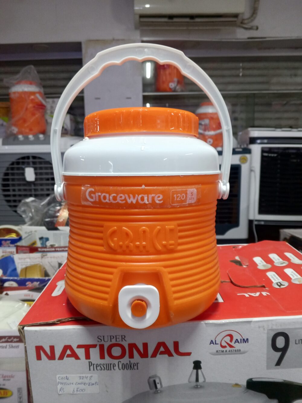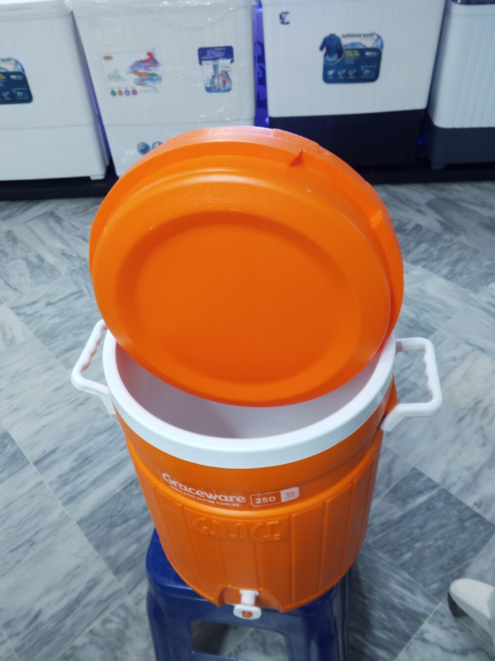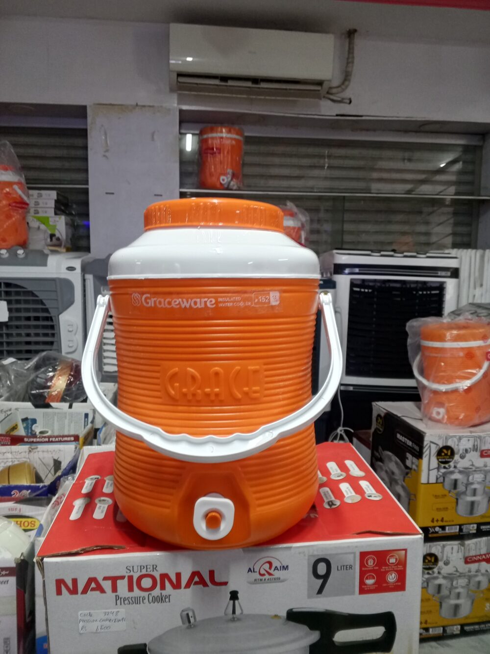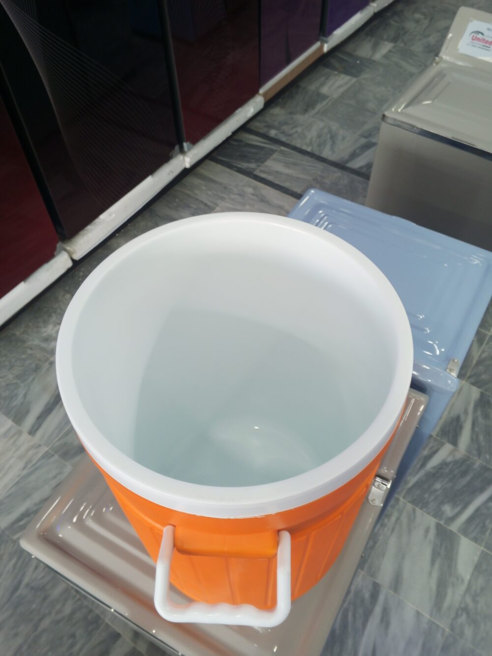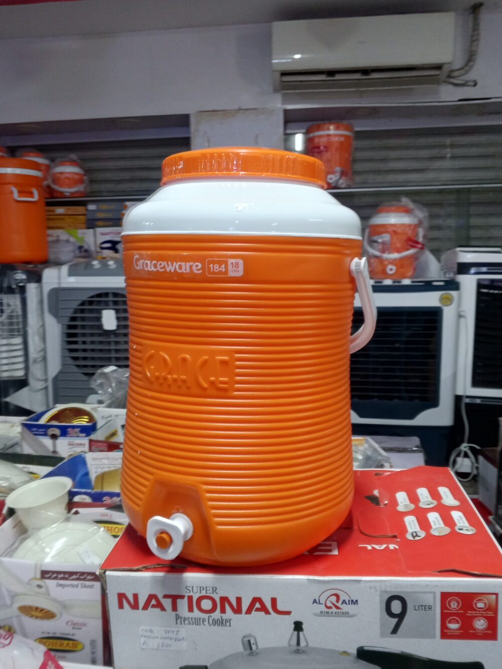 crockery items, plastic water cooler
