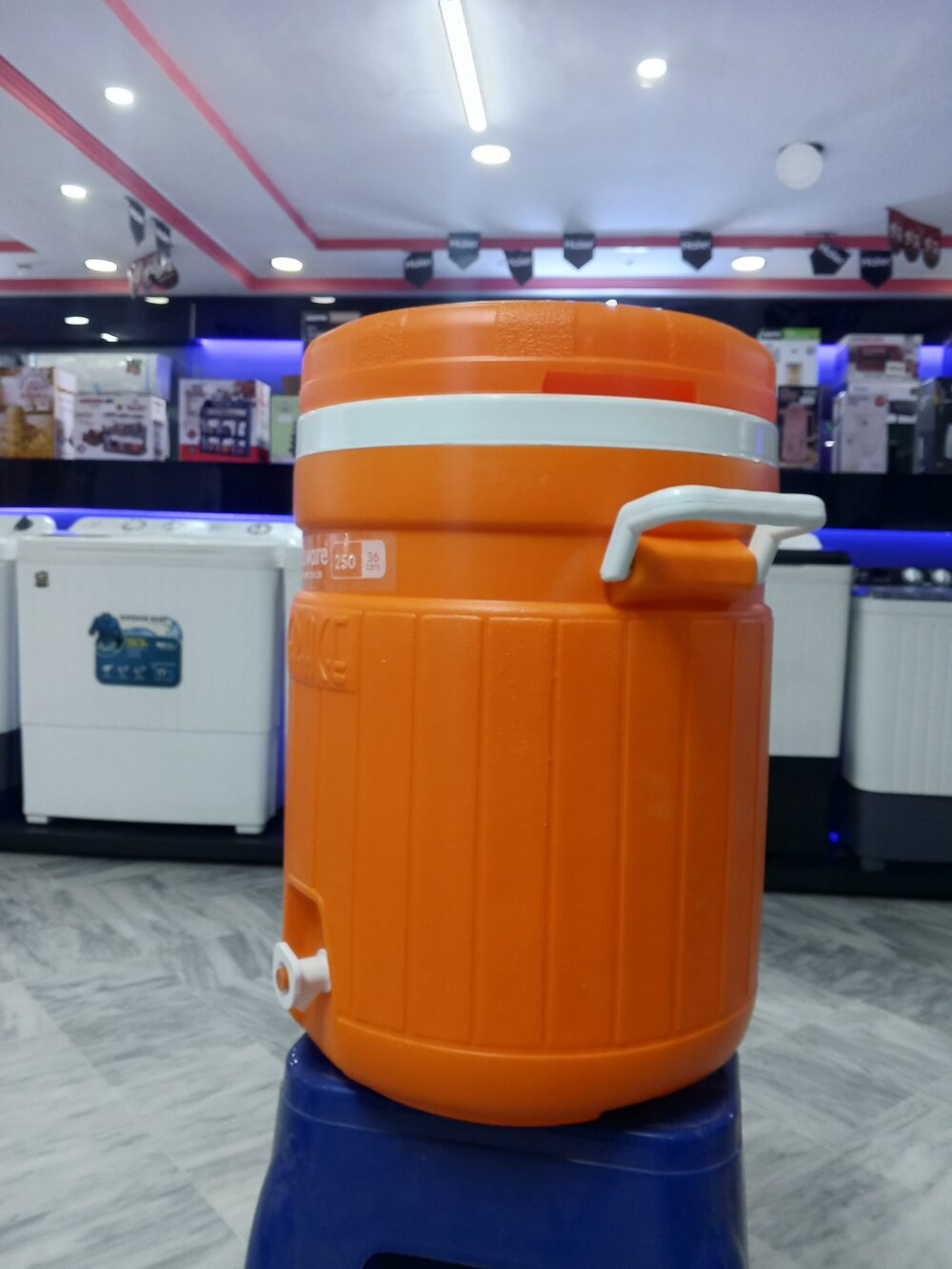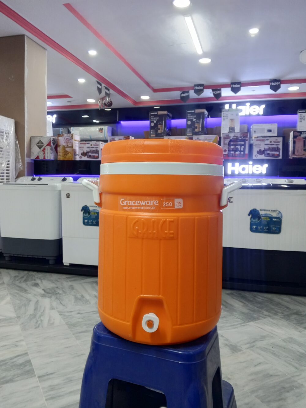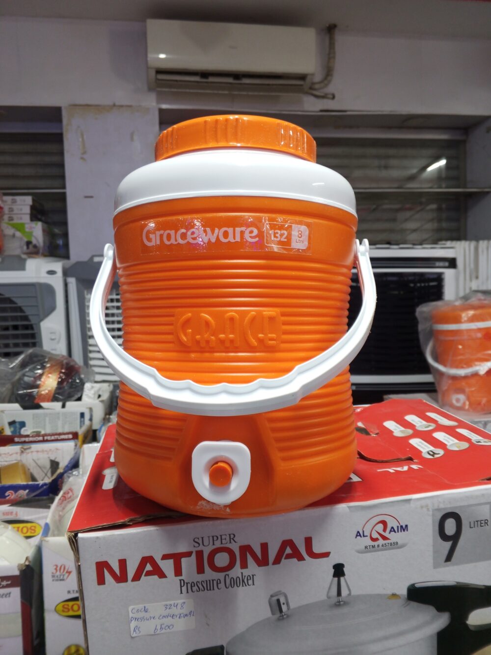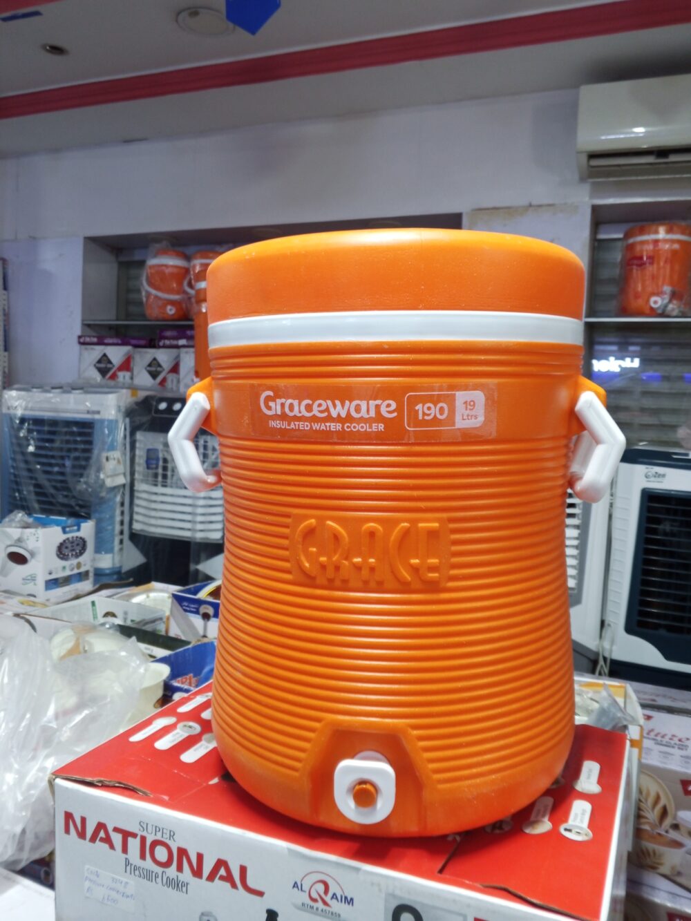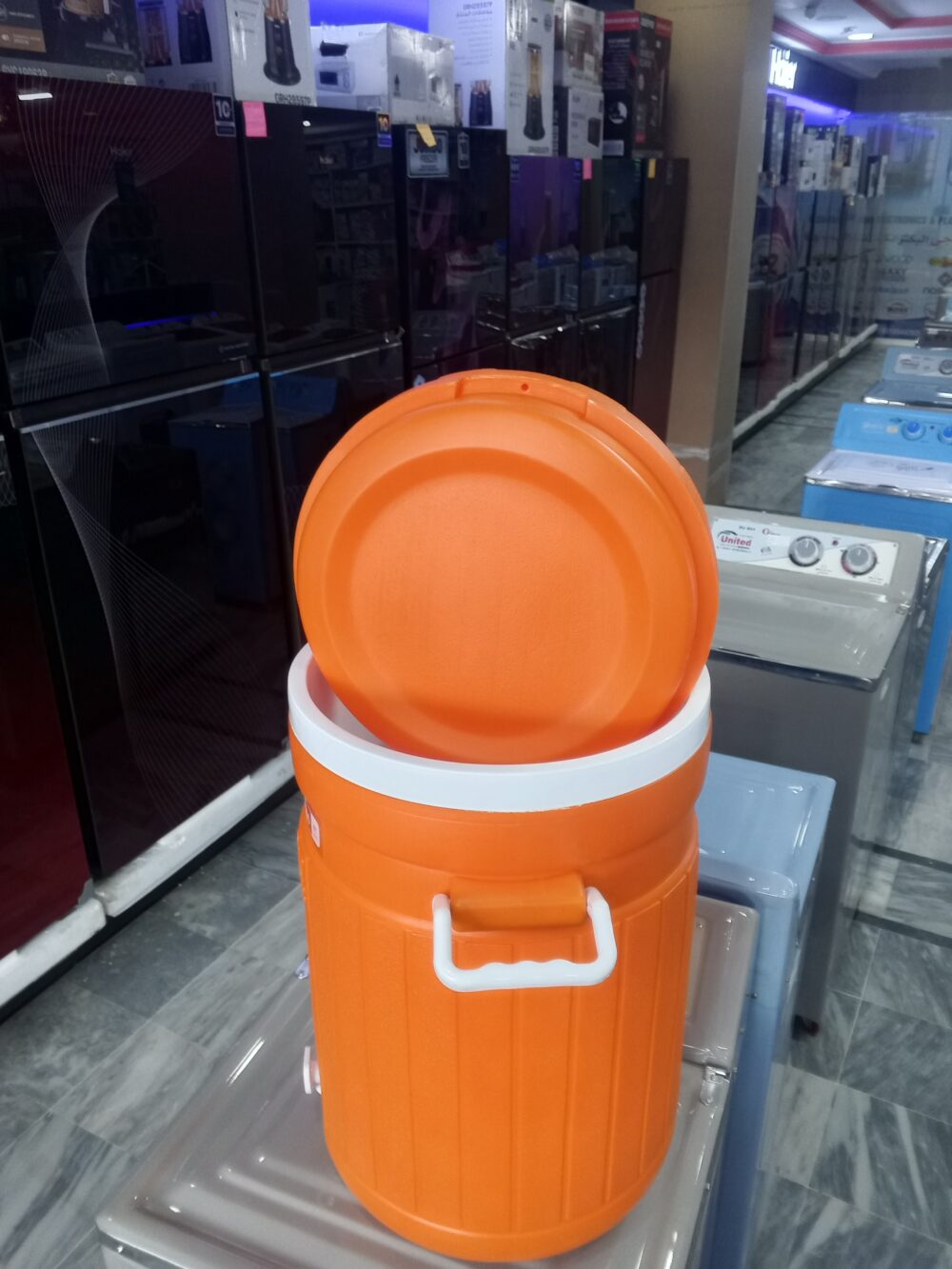 crockery items, plastic water cooler